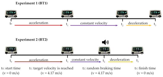 Figure 3 shows experiments BT1 and BT2, where the unique difference is the time between t1 and t2, because the time when the autonomous bus starts braking in the BT2 experiment (t2) is randomly selected.