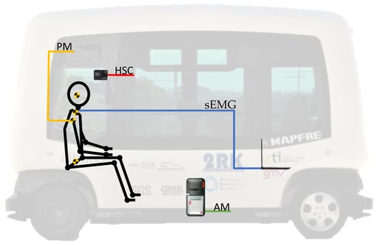 Devices used in the emergency braking test. PM: Position Markers, HSC: High-Speed Camera, AM: Accelerometer, sEMG: Sensors of Surface Electromyography. Based on [].