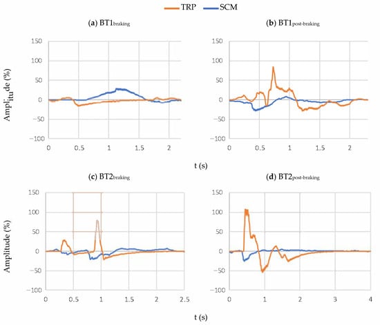 sEMG signal from the SCM and TRP muscles from one volunteer. The signal has been split according to the experiment and to the time of the braking. (a) BT1 braking time; (b) BT1 post-braking time; (c) BT2 braking time; (d) BT2 post-braking time.