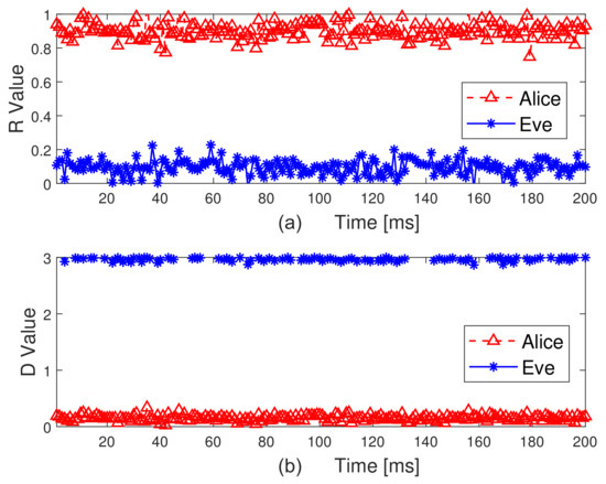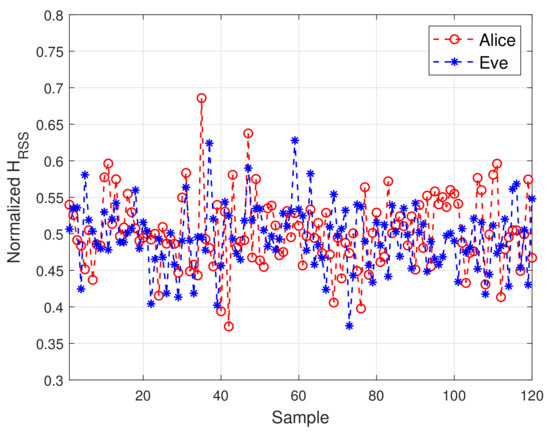 Figure 2 shows the experimental setup for the physical layer attribute sampling. The Wi-Fi signal is sent from the sender to the receiving device and is stored in the computer. The legitimate transmitter, Alice, is placed on one side of the table, and the receiver, Bob, is on the opposite side. In the experiment, there was interference between the