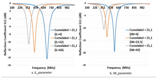 First, to simulate the CFTA M8063, the conductivity value of 270.9 S/m (K271) was inserted into CST. Its outer dimension in millimeter was L = 80 mm, W = 63 mm as shown in Figure 1. The gap in which to place the tag ship was 2 mm, and iW was 43 mm. All parameters were kept as in Figure 2, and only the parameter sweep was conducted for iL= 4, 32 and 60 mm. The parameter iL4 (4 mm) presented a simulation CFTA impedance of Za = 57 − j128Ω, iL32 (32 mm) and impedance of Za = 148 − j261 Ω. The parameter iL60 (60 mm) was the same size with the measured CFTA M8063 in Figure 1. The simulated impedance for iL60 shows Za = 100 − j242, as shown in Table 1; this value was close to the measured impedance at 920 MHz, which was Za = 120 − j230. Since the resonant frequency of iL4 was about 650 MHz, close to the 920 MHz, as shown in Figure 3, Figure 3a shows that the reflection coefficient S11 of all three parameters resonates below 700 MHz. We trace the graph to resonate at 920 MHz. The parameter iL4 resonance was closer to 920 MHz compared to other parameters. We needed to tune to reach the resonance at 920 MHz.