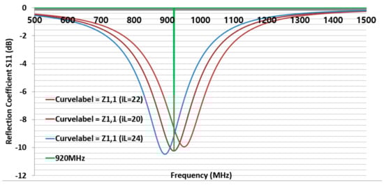 Second, to simulate the CFTA M4023, the conductivity K124 was inserted in CST. The size of M4023 was reduced compared to the size of M8063. Its outer dimensions were L = 40, W = 23, gap 2 mm, and iW was 4 mm. First, all parameters were the same as Figure 3, and only the parameter sweep was done for iL = 20, 22, and 24 mm. The parameter iL22 (22 mm) presented a simulation CFTA impedance of Za = 50 + j193 Ω. Figure 4 shows the CFTA results of the parameter sweeps, and M4023 iL = 22 mm resonated at 920 MHz. The reflection coefficient S11 was −10.2 dB. This CFTA neesded to be fabricated to measure S11 and the impedance of the antenna, Za, and to compare results.
