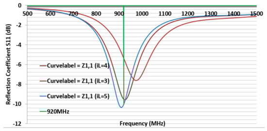 Third, to simulate the CFTA P8040, the conductivity K186 was inserted into CST. Its outer dimensions were L = 80, W = 40, gap 2 mm. First, all parameters were kept as the values shown in Figure 2; the parameter sweep was only conducted for iL =3, 4 and 5 mm. The parameter iL5 (mm) presented a simulation CFTA impedance of Za = 52 + j197 Ω. The result of parameter sweeps of iL are shown in Figure 5. Figure 5 shows that the CFTA P8040 iL5 matched with the chip at 920 MHz. The reflection coefficient S11 is −10 dB. This CFTA need to be fabricated to measure S11 and Za and to compare results. Since the last two CFTA M4023 and P8040 presented a matched result, the following study will focus on the comparison of the two antennas.