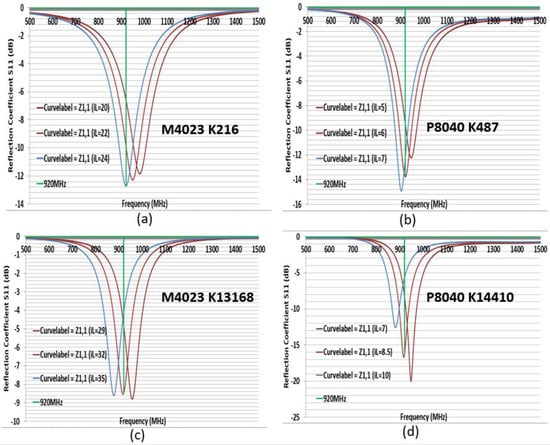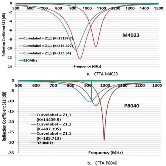 Figure 6 shows the reflection coefficient S11 comparison. For a fixed size, the more the conductivity K increased, the more the resonance point moved to a higher frequency. M4023 presented K13167 impedance Za = 76 + j141 Ω; K216 Za = 39 + j182 Ω; K124 Za = 50 + j193 Ω. P8040 presented K14410 Za = 13 + j161 Ω; K487 Za = 36 + j179 Ω; K186 Za = 52 + j197 Ω. We need to tune the CFTA size for each K that it resonates at 920 MHz. The well-tuned parameter values of the CFTA M4023 K124 and CFTA P8040 K186 are, respectively, in Figure 4 and Figure 5. The well-tuned parameter values of M4023 K216, M4023 K13168, P8040 K487 and P8040 K14410 are shown in Figure 7.