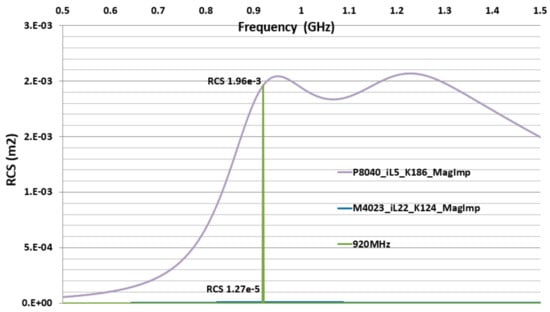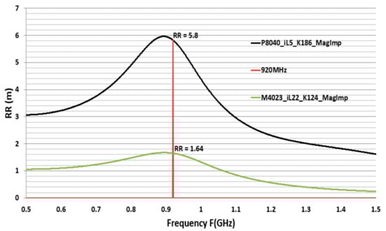 Two CFTA M4023-iL22-K124-MagImp and P8040-iL5-K186-MagImp are compared by their radar cross-section RCS and read-ranges, RR. At the resonance frequency 920 MHz, the Higgs3 chip impedance is Zc = 27 − j200 Ω, CFTA M4023-iL22-K124-MagImp’s gain G = −15.3 dB, antenna impedance Za = 50 + j193 Ω, and antenna real impedance Ra = 50 Ω. Using Equation (9), the RCS is 1.27 × 10−5 . CFTA P8040-iL5-K186-MagImp’s gain is G = 4.34 dB, antenna impedance Za = 52 + j197 Ω, and antenna real impedance Ra = 52 Ω. Using Equation (9), the RCS is 1.96 × 10−3 . Figure 8 shows the comparison variation of the two CFTA RCS. The UHF Alien-9900 reader’s Effective Isotropic Radiation Power EIRP = = 4w, the minimum power to activate the Higgs3 chip, is ; the chip real impedance . The matching coefficient is . CFTA M4023-iL22-K124-MagImp’s matching coefficient = 0.9, and the read-range is RR = 1.64 m. CFTA P8040-iL5-K186-MagImp’s matching coefficient = 0.9, and the read-range is RR = 5.8 m.