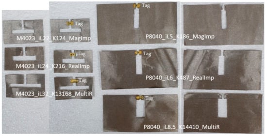 M4023 with K216 is matched with the tag for a reflection coefficient S11 = −12.7 dB, L = 40, W = 23, gap = 2, iW = 4, iL = 24 mm and the impedance Za = 43 + j196 Ω. M4023 with K13168 is matched with a tag for a reflection S11 = −8.5 dB, L = 40, W = 23, gap = 2, iW = 4, iL = 32 mm and the impedance Za = 13 + j204 Ω. P8040 with K487 is matched with the tag for a reflection coefficient S11 = −13.7 dB, L = 80, W = 40, gap = 2, iW = 20, iL = 6 mm and impedance Za = 40 + j194 Ω. P8040 with K14410 is matched with the tag for a reflection coefficient S11 = −16.3 dB, L = 80, W = 40, gap = 2, iW = 20, iL = 8.5 mm and impedance Za = 21 + j204 Ω. The matched CFTA are fabricated and their measured results are compared.