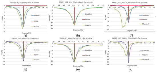Six different fabricated CFTA tag antennas are shown in Figure 10; CFTA without tag were used to measure the antenna characteristics such as the reflection coefficient S11 and impedance Za. CFTA with tags were used to measure the outdoor read-range. The tag was attached to the fabric antenna using conductive ELCOAT ink paste. Figure 11 compares the simulation and measured reflection coefficient S11. The CFTA designed based on conductivity K of the real impedance M4023_iL24_K216_RealImp, P8040_iL6_K487_RealImp, and conductivity based on the Multimeter resistance R M4023_iL32_K13168_MultiR, P8040_iL8.5_K14410_MultiR showed a measured reflection coefficient S11 shifted to the left. Therefore, their simulation and measured resonance frequencies differ. This is why, in the previous sections, we omitted them from the RCS and read range comparison to save time, while the CFTA designed based on the magnitude impedance M4023_iL22_K124_MagImp and P8040_iL5_K186_MagImp showed the simulation and measured reflection coefficient S11 resonance at 920 MHz.