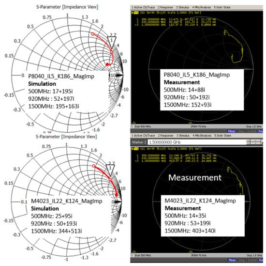 At 920 MHz, M4023_iL24_K216_RealImp presents a reduced measured S11 of −9.5 dB, and the simulation S11 is −12.7 dB. The difference is caused by their simulation and measured impedance results. The simulation impedance is Za = 43 + j197 Ω and the measured impedance is Za = 46 + j218 Ω. P8040_iL6_K487_RealImp presents a reduced measured S11 of −7.5 dB, and the simulation S11 is −13.7 dB. The simulation impedance is Za = 40 + j194 Ω and the measured impedance is Za = 62 + j216 Ω. M4023_iL32_K13168_MultiR presents a reduced measured S11 of −3.3 dB and the simulation S11 is −8.5 dB. The simulation impedance is Za = 13 + j204 Ω, and the measured impedance is Za = 79 + j270 Ω. P8040_iL8.5_K14410_MultiR presents a reduced measured S11 of −4.7 dB and the simulation S11 is −16.3 dB. The simulation impedance is Za = 21 + j205 Ω and the measured impedance is Za = 74 + j243. M4023_iL22_K124_MagImp presents a measured S11 of −11.7 dB and the simulation S11 is −10.2 dB. The simulation impedance is Za = 50 + j193 Ω and the measured impedance is Za = 53 + j199 Ω. P8040_iL5_K186_MagImp presents a measured S11 of −10 dB and the simulation S11 is −10.4 dB. The simulation impedance is Za = 51 + j197 Ω and the measured impedance is Za = 50 + j192 Ω. The simulation and measured impedance of the CFTA M4023_iL22_K124_MagImp are almost similar. The simulation and measured impedance of the P8040_iL5_K186_MagImp are also almost similar. Therefore, the simulation and measured reflection coefficient resonate at the same frequency of 920 MHz.