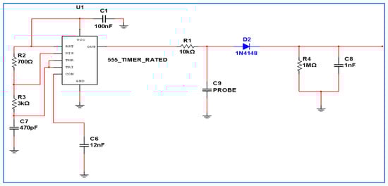 The sensor probe consists of a conductive copper plate located at the center, and a ground plate goes around it. The sensor probe consists of two parallel copper layers on a printed circuit board (PCB) FR-4 type double sided with 1.6 mm thickness, and the thickness of the copper is 35 μm. The dimensions of the effective part of the sensor were 20 mm by 60 mm, with a tipped end to insert it easily into the soil. The electronic tracking of the sensor was installed on the same PCB. The sensor electric circuit is basically an RC low-pass filter that receives a 430 kHz fixed square wave frequency from the 555 timer. Different parts of the electrical circuit of the proposed sensor are shown in Figure 1 and Figure 2. If the capacitance of the RC capacitor increases, the output signal will be filtered. Hence, the triangular signal will decrease in amplitude as the capacitance of C9 increases. A capacitor basically consists of conductive plates and a dielectric, and thus the capacitance of the capacitor is a function of the plates area and the permittivity of the dielectric between the plates or in the electric field around the plates. Thus, this capacitance can be changed by either changing the geometry of the copper plates or spacing between them. In our case, the geometry of the probe and the space between the parallel copper tracks are fixed; therefore, the change in the capacitance will be due to the change in the dielectric, according to Fares and Polyakov [31]: