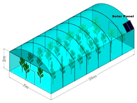 The powering unit included photovoltaic panels of 120 W–22 V–6 A placed on the roof of the greenhouse surface (Figure 3) where sunlight intensity was expected to be higher. These solar panels, during the daytime, charged the batteries that operated the control unit. The rest of this unit comprised a charger (12 V/24 V–30 A) and MPPT unit, which maximized the power rate under different conditions, and a 12 V–7 A battery.