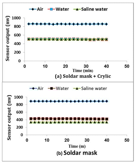 Figure 4 shows the sensor sensitivity response in readings when coated by solder mask and when coated by solder mask plus acrylic varnish in varying conditions (air, water, and saline water). It is obvious that solder mask with acrylic had a stable response in both fresh and saline water (salinity up to 20 dS m−1). However, the solder mask had response changes for saline water. Thus, the sensor with acrylic varnish is unsusceptible to the ions of the salt (no direct current), and thus one of the problems of measuring soil moisture content based on the dielectric technique was managed. Additionally, there were no significant differences in the readings of the sensor insulated by solder mask and cosmetic acrylic varnish either in fresh or saline water.