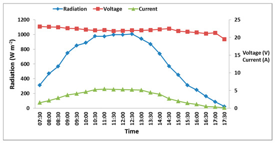 As depicted in Figure 6, the peak of solar radiation was recorded from 09:00 to 14:00, with an average value of 743 W/m2. The current generated from the tested solar panel was highly related with the change in the radiation that was recorded—1.54 A at 07:30 at radiation value of 312.60 W/m2—and both parameters increased with the day’s passing time until they reached their peak at 10:30 and remained relatively constant until 12:30. After that, the radiation and the current started to decrease until recording their minimum values at 17:30. On the contrary, the change in voltage was little throughout the day, and the highest value of 23.1 V was recorded at 07:30, while the lowest value of 19.5 V was recorded at 17:30. The greatest output was recorded between 09:00 and 14:00, which is close to 80–85% of the 120 W output expected from the solar cells. Although it is expected that the maximum output power should be at 12:00 due to the peak of the radiation and because the input power is highest, the produced power decreased because of the increasing temperature of the solar panel surface. The calibration test also showed that the maximum solar panel efficiency was 11.08% at 11:00, with 945.40 W/m2 and 55.14 °C for the sun radiation and the surface temperature of the solar panel, respectively.