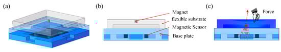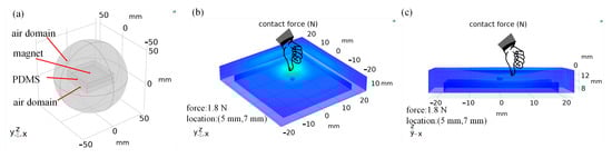 Flexible magnetic-based tactile sensor simulation model: (a) components of the model; (b,c) the simulation results of force applied to FMFTS with the magnitude of 1.8 N and the location of (5 mm, 7 mm).