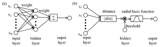 Structure of neural networks. (a) BP neural network; (b) RBF neural network.