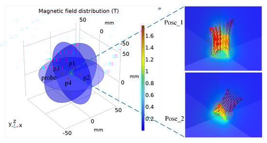 In this section, the finite element model of the permanent magnet is firstly established in COMSOL 5.5 (COMSOL Inc., Stockholm, Sweden). The size of the permanent magnet is set to 2 mm in diameter, 2 mm in height, and the material is NdFeB. Taking a sphere with the radius of 50 mm around the permanent magnet as the air model, the outer surface of the sphere is selected as the zero magnetic scalar potential surface and used as the initial condition for applying the magnetic field. In order to obtain the magnetic flux density in the space, domain point probes were set at four points, namely p1 (8, 8, 0), p2 (8, −8, 0), p3 (−8, 8, 0), and p4 (−8, −8, 0), equivalent to four magnetic sensors, as is shown in Figure 5.