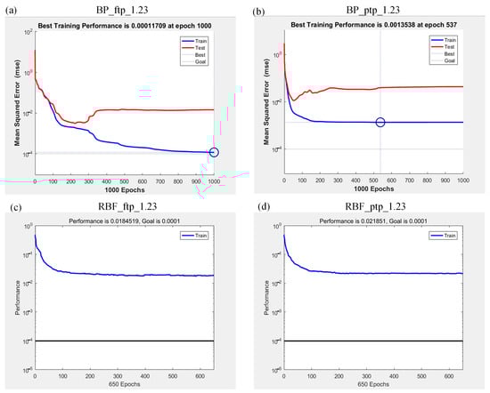 The neural network’s performance of the four cases is shown in Figure 7. As can be seen from Figure 7, the performance of BP_ftp_1.23, BP_ptp_1.23, RBF_ftp_1.23, and RBF_ptp_1.23 are 0.00011709, 0.0013538, 0.0184519, and 0.021851, respectively. The performance of BP_ftp_1.23 is slightly better than BP_ptp_1.23, and RBF_ftp_1.23 is also slightly better than RBF_ptp_1.23, which can be explained by the fact that the pose estimation of permanent magnet is an optimization process and causes discontinuities between the train data, and the RBF neural network does not perform as well as the BP neural network in this scenario (note: “Test” in Figure 7a,b represents a part of the data extracted from the training set to verify the performance of the network, and the specific test results are as follows).
