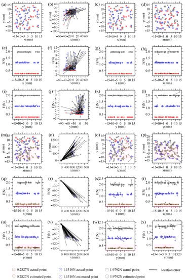 Force and location estimation results: (a–l) are the estimation results of BP neural network; (m–x) are the estimation results of RBF neural network; (a,b,e,f,i,j) case 1, (a) actual locations and estimated locations based on test datasets from FMFTS with remanence of 1.23 T, (e,i) actual forces and estimated forces based on test datasets from FMFTS with remanence of 1.23 T, (b) actual locations and estimated locations based on test datasets from FMFTS with remanence of 1.28 T, (f,j) actual forces and estimated forces based on test datasets from FMFTS with remanence of 1.28 T; (c,d,g,h,k,l) case 2, (c) actual locations and estimated locations based on test datasets from FMFTS with remanence of 1.23 T, (g,k) actual forces and estimated forces based on test datasets from FMFTS with remanence of 1.23 T, (d) actual locations and estimated locations based on test datasets from FMFTS with remanence of 1.28 T, (h,l) actual forces and estimated forces based on test datasets from FMFTS with remanence of 1.28 T; (m,n,q,r,u,v) case 3, (m) actual locations and estimated locations based on test datasets from FMFTS with remanence of 1.23 T, (q,u) actual forces and estimated forces based on test datasets from FMFTS with remanence of 1.23 T, (n) actual locations and estimated locations based on test datasets from FMFTS with remanence of 1.28 T, (r,v) actual forces and estimated forces based on test datasets from FMFTS with remanence of 1.28 T; (o,p,s,t,w,x) case 4, (o) actual locations and estimated locations based on test datasets from FMFTS with remanence of 1.23 T, (s,w) actual forces and estimated forces based on test datasets from FMFTS with remanence of 1.23 T, (p) actual locations and estimated locations based on test datasets from FMFTS with remanence of 1.28 T, (t,x) actual forces and estimated forces based on test datasets from FMFTS with remanence of 1.28 T.