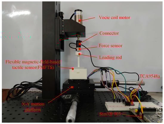 As is shown in Figure 10, the calibration platform for FMFTS consists of the X–Y motion platform (DZWNX120-CD, Winner Optics, Beijing, China), voice coil motor (CBL35-010-71-1M3A, SMAC, Carlsbad, CA, USA), force sensor (LSZ-F02C, OBTE, Suzhou, China), and a 6 mm diameter loading rod. The force exerted on the tactile sensor can be controlled by the voice coil motor and force sensor, and the X–Y motion platform controls the position of the force exerted on FMFTS.