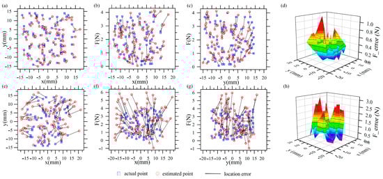 The force and location experimental estimation results using testing datasets are shown in Figure 12, and the mean absolute error (MAE) and root mean squared error (RMSE) are summarized in Table 4. The training sets are acquired on Sensor_1, Figure 12a–d are the test results using datasets acquired from Sensor_1, Figure 12e–h are the test results using datasets acquired from Sensor_2; BP_ftp_Sensor_1 in Table 4 gives MAE and RMSE. It can be seen that the mean absolute error of x, y, and F of Sensor_1 are 0.7923 mm, 0.9889 mm, and 0.3385 N, respectively. The mean absolute error of x, y, and F of Sensor_2 are 2.8450 mm, 2.2251 mm, and 1.2008 N, respectively, which indicates that by using the neural network trained by Sensor_1, Sensor_2 can also estimate contact force and location. Compared with the location error, the force error is larger.
