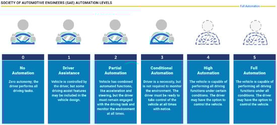 According to the Society of Automotive Engineers (SAE), the Advanced Driver-Assistance System (ADAS) is a six-tiered system that categorizes the different levels of autonomy. It ranges from vehicles being solely human-driven to those that are completely autonomous or self-driving, as shown in Figure 1 []. In order to achieve higher autonomy levels, autonomous vehicles (AVs) must rely on a combination of sensors and software to perceive the surrounding environment and navigate without any human intervention. Currently, cutting-edge sensor technologies are rapidly growing to improve autonomous transportation and mobility that is safe for pedestrians and riders []. This has motivated more researchers and engineers, from a variety of fields and backgrounds, to engage in this process and to address all the interconnected challenges that accompanies it. Figure 2 provides a brief summary of the influential events in the history of AVs [,].