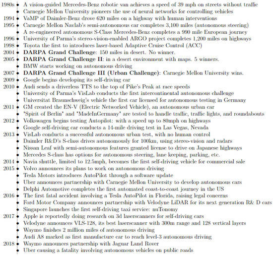 - History of Autonomous Cars. Available online: https://en.wikipedia.org/wiki/History_of_self-driving_cars (accessed on 10 June 2020).
