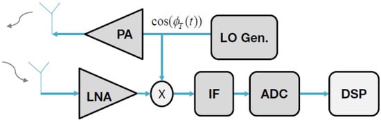 The RADAR systems for AVs operate at 24, 74, 77, and 79 GHz (millimeter wave (MMW)), which are separated out to work for short-range, medium-range, and long-range RADAR (SRR, MRR, and LRR, respectively) []. An LRR can be implemented to detect far targets or objects in front of the ego car, and MRR and SRR, on the other hand, are used for parking assistance or side view detection []. Among a plethora of RADAR technologies available nowadays, linear Frequency-modulated continuous-wave (L-FMCW) RADARs are commonly used in AVs due to their simplicity. Figure 5 shows a top-level block diagram of an FMCW RADAR, where the voltage-controlled oscillator (VCO) module generates an L-FMCW chirp signal that is amplified by the power amplifier (PA) and transmitted by the antenna. The receiving antenna captures the echo signal and the low noise amplifier (LNA) amplifies it before mixing it with the VCO signal in order to generate the intermediate frequency (IF) or beat signal. The analog to digital converter (ADC) then digitizes the signal and passes it to the digital signal processing (DSP) module.