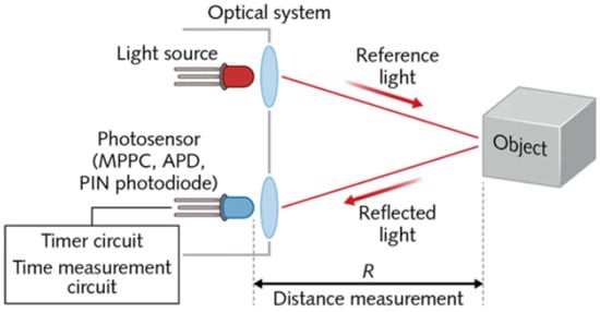 LiDAR is an acronym for Light Detection and Ranging, which is a technology developed in the 1970s to be deployed on space platforms and airborne platforms. In a similar fashion to RADARs, LiDAR systems base their operation on measuring the time it takes a pulse of light, in infrared or near-infrared ranges, emitted from a laser diode until it is received by the system’s receiver, which is also known as the time-of-flight (ToF) principle. In ToF technology, the LiDAR generates a pulse of light with a specified duration () that, at the time of emission, triggers the internal clock in a timing circuit. The reflected light pulse from the target is detected by a photodetector, which produces an electrical output that disables the clock. The distance to the reflection point may be calculated by using this electronically measured round-trip ToF (Δt) [], as indicated in Equations (2) and (3):