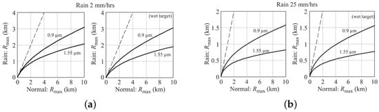 LiDARs transmitting in the 905 nm and 1550 nm wavebands will be heavily affected by Mie scattering from rain. Figure 9 shows the visibility deterioration on LiDAR during different rain intensities []. As can be observed from Figure 9a, LiDAR visibility in clear conditions, which should have been ~2 km at these wavebands, has been deteriorated to approximately 1.2 km for the 905 nm band and 0.9 km for the 1550 nm band in 2 mm/h rain. When the rain rate increases to 25 mm/h, the 2 km visibility drops to 0.7 km and 0.45 km for wavelengths 905 nm and 1550 nm, respectively, as illustrated in Figure 9b. The wetness of the target decreases the visibility by an additional addend of 0.1 km. However, within the range of 250 m usually required for rangefinders on AVs, LiDAR susceptibility to rain is not as noticeable until more severe rain rates occur, as shown in Figure 10 [].