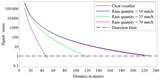 LiDAR sensors are vulnerable to precipitation conditions such as snow, hail, sleet, and rain, as shown in Figure 20. However, as a short wavelength technology, LiDAR can identify small objects and provide a precise 3D monochromatic picture of an item, which RADAR may lack. The perception of objects is predicted to be severely affected by inclement weather and a decrease in detection range. As a result of the diminished contrast in intensity, there is an increase in misclassifications and even incorrect detection systems []. If the raindrop is very close to the laser emitter, there is a considerable possibility of erroneous detection. Since the laser beam meets a particle and causes a flash of light similar to a small surface, there will be a return of peak that is similar to that of a road item [].