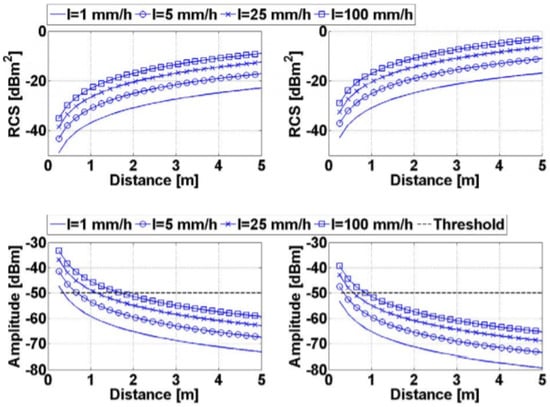 For 77 GHz RADAR systems used in AVs ( ≈ 3.9 mm), the effect of attenuation is not significant at short distances []. It ranges from 0.0016 dB/m for 1 mm/h to 0.032 dB/m at 100 mm/h []. However, rain backscattering or rain clutter can decrease the maximum range of detectability, as discussed in [,]. Moreover, since the received backscatter from the rain depends on R2 instead of R4 for the target echo where R is the range, rain clutter can exceed the detection threshold and results in false alarms. Figure 11 summarizes the results of an experiment conducted by [] in order to evaluate the effects of rain volume backscattering on 77 GHz RADARS used in AVs. It demonstrates rain RADAR cross section (RCS) and its received power for different rain rates and ranges and for narrow and wide beam RADAR systems.