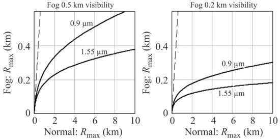 Range degradation curve observed when 905 nm and 1550 nm are subjected to 0.5 km and 0.2 km visibility fog.