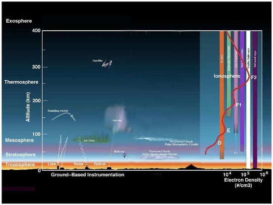 The ionosphere is abundant in electrons and ionized particles and renders radio communication possible []. This layer also can shift in size, depending mainly on solar influence []. GNSS operates in this region and can be influenced by interrupting wavelengths and objects coming in from the exosphere. The troposphere, unlike the ionosphere, has the benefit of multiple layer protection, where meteors can be disintegrated in the mesosphere and ultraviolet radiation can be absorbed and dispersed through the stratosphere’s ozone layer []. Technology utilized in the ionosphere is at a higher disadvantage if something were to permeate the planet’s atmosphere, observed in Table 5.