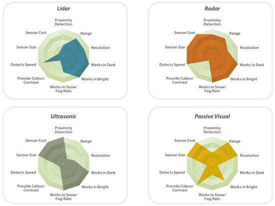 Spider diagrams showing strengths of various sensors found in automobiles. (Image source: www.cleantechnica.com; accessed on 12 March 2021).