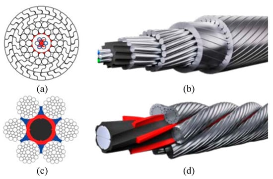 Main types and structure of wire rope. (a) Section of sealing wire rope; (b) Appearance of sealing wire rope; (c) Section of unsealed wire rope; (d) Appearance of unsealed wire rope.