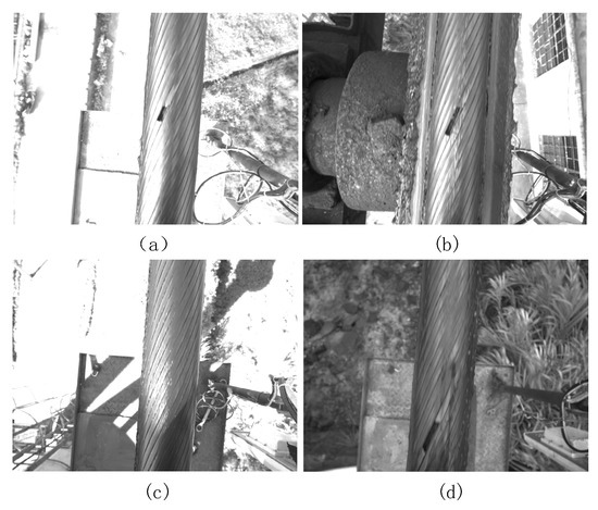 Complex representation of wire rope image. (a) Strong light and reflection; (b) Weak light; (c) Uneven light; (d) Oil stain on wire rope surface.