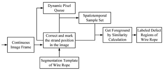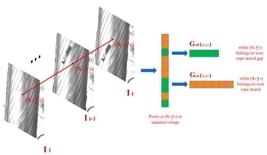 When the outdoor camera is fixed, the changing area in the fixed scene is extracted, and the dynamic background modeling method is usually used. The background modeling process is shown in Figure 2. The background model is dynamically constructed for the real-time image sequence, and the scene change area, that is, the foreground area, is obtained through the difference between the dynamic background and the real-time image frame. For the continuously collected outdoor sealed steel wire rope images, the change of pixel gray in the surface area of steel wire rope is similar to the application scene of the background modeling method. In the time domain, the pixels in the image sequence of wire rope surface area at the same position may be rope strand edge, rope strand surface, oil sludge, or fracture, but the gray levels of pixels in one type are similar in the time domain. At the same time, the gray levels of rope strand edge and fracture are similar, the gray levels of wire rope surface and oil sludge are similar, but the gap gray level is significantly different from that of wire rope surface; In the spatial domain, the gray level of the rope strand area pixels or the rope strand edge area pixels in the wire rope surface area image is similar. According to the above wire rope image characterization, the change model of a single-pixel in the image can be established, and the defect area on the wire rope surface can be extracted by using a methodology similar to dynamic background modeling. The classical dynamic background modeling methods such as the visual background extractor (VIBE) method proposed by O. Barnich et al. [,], which established a random replacement background model for each pixel; an adaptive background mixing model based on KNN (k-nearest neighbor) proposed by Stauffer C et al. [], which modeled each pixel and realized foreground segmentation by using the idea of nonparametric probability density estimation and KNN classification; the MOG2 method of Gaussian mixture model proposed by Zivkovic Z [,,], which realized dynamic background modeling by using parametric probability density estimation, Gaussian mixture distribution, and shadow detection [].