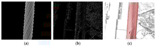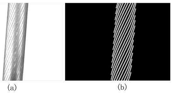 where , , is the image width, is the image height, and are linear formula coefficients. OSTU (Nobuyuki Otsu Method) [] adaptive threshold segmentation is performed on the collected image. The gray value of darker pixels is set to 1 and the gray value of brighter pixels is set to 0. The connected domain of the resulting image is analyzed and the connected domain with smaller areas is removed. Finally, the marked steel wire rope segmentation template is obtained. Figure 5a is the steel wire rope image and Figure 5b is the segmentation template.