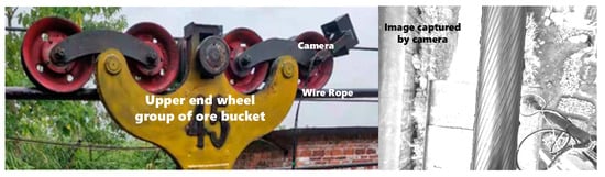 In practical application, the image acquisition equipment is erected on the axle of the ore bucket car. As shown in Figure 6, the image acquisition equipment is in relative motion with the steel wire rope, the image of the upper surface of the wire rope collected by the MV-CA030-10GC industrial camera (Hikvision, Hangzhou, China). The left and right positions of the rope in the real-time steel wire image collected by the equipment are basically consistent. Although the surface texture of the steel wire rope changes rapidly along the rope direction, the steel wire rope segmentation template can be translated a certain distance along the rope direction to make the edge information of the rope strand in the template coincide with the edge information in the real-time image. Based on the above characteristics, in order to solve the problem of rope strand segmentation under the condition of oil sludge coverage, reflection, and uneven illumination, a rope strand segmentation and correction method based on the steel wire rope segmentation template is proposed in this paper.