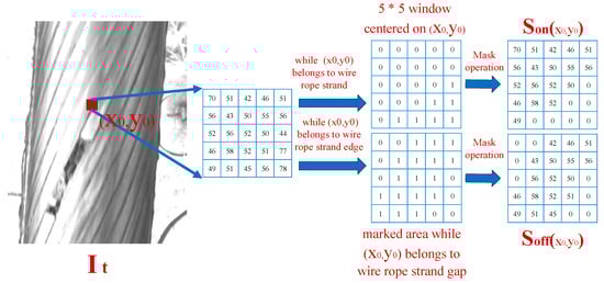 The spatiotemporal gray sample set is used to detect defects in the process of traversal each pixel in the current image. Take as an example to calculate the sample value distance in the sample set with its corresponding sample number . To calculate the distance, we need to select the sub-set of the rope strand or the sub-set of the rope strand edge according to the pixel location, determine whether the distance is less than the corresponding set threshold (rope strand pixel threshold) or (rope strand edge pixel threshold), and count the number of samples less than the set threshold .