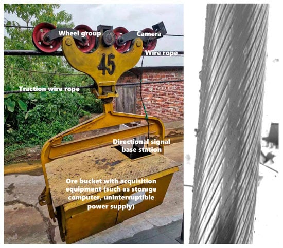 We considered the heavy load rope on a lead-zinc mine ropeway system as the experimental object. The load rope uses two layers of Z-sealed steel wire rope. The diameter is 50 mm, the length is 1422 m, and the load rope is used to carry a full load in a mine bucket car. In this study, dedicated image acquisition and a simultaneous transmission system were built using an empty bucket truck, as shown in Figure 12. The bucket truck contained an industrial control computer, two-directional base stations, a camera power supply, a gigabit Ethernet switch, and an uninterruptible power supply (UPS). The image acquisition device was fixed to the axle bearing of the bucket truck, with the camera axis coinciding with the rope. The image acquisition part of the system comprised an MV-CA030-10GC industrial camera model (Hikvision, Hangzhou, Zhejiang, China). The camera supports the GIGE protocol and has a resolution of 1920 × 1440 pixels, a bit depth of 8 bits, and a real-time image acquisition frame rate of 20 frames/s. The bucket truck travels at a speed of 0.2 m/s. The two-directional base stations in the bucket truck and those installed at both ends of the ropeway form a wireless communication network. For real-time image preview and fracture analysis, the industrial camera collects images, which the industrial control computer in the bucket transmits to the wire rope surface defect analysis host in a monitoring room through the wireless network built between the base stations.
