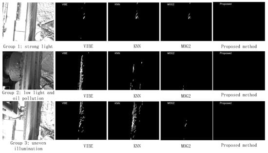 For the second group of tests, as shown in Figure 14, the complex environment has varying degrees of impact on VIBE, KNN, and MOG2. It can be seen from Table 2 that the complex environment has little impact on the method in this paper, and the false detection area is mainly reflected in the oil stain with a dark grayscale. The second group of experiments showed that bright light has little effect on VIBE, KNN, and MOG2 and basically has no effect on the algorithm used in this study. However, the bright reflective area on the rope strand was still mistakenly detected as a defective area by VIBE, KNN, and MOG2. Weak light oil has a greater impact on VIBE because it does not consider the sealed wire rope texture and its random turnover mechanism is unsuitable for this environment. KNN and MOG2 algorithms are weakly affected by oil stains, but oil stains’ heavy local highlighted pixels are misdetected. In the case of uneven illumination, the pixel grayscale difference between the rope strand gap and the rope strand has a greater impact on the VIBE and KNN algorithms, mainly because VIBE misapplies spatial information and VIBE and KNN are not applicable to fast, regular-texture-change image sequences. The multi-distribution model in MOG2 simulates the grayscale distribution and fits the image sequence of regular texture changes to a certain extent, so it is less affected by regular texture changes on the surface of the sealed wire rope. The algorithm in this study is designed to apply the spatial texture distribution law of a wire rope from two perspectives, time domain and space domain, and the pixels with gradient mutation are treated separately in the model-updating strategy, so the proposed algorithm has good adaptability to the complex environment in sealed wire rope detection.