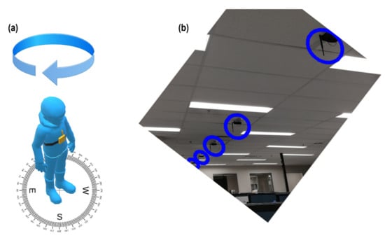 Experimental setup to measure user’s body effect. (a) Wearable device attached to the chest of a user; (b) reference nodes attached beneath the ceiling (marked by circles).