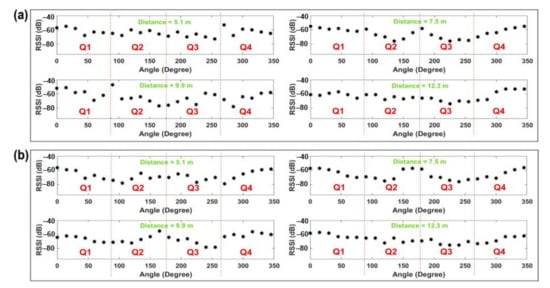 As can be observed from Figure 2, there is a similar trend in the ups and downs of the RSSI values for the different angle positions. The general trend shows the highest RSSI values when the body is placed at , which is the straight LOS between the transmitter and the receiver. Then, the RSSI values start decreasing with the body’s rotation throughout the first quarter (Q1) and reach the lowest at around the ending of Q1 and the starting of the second quarter (Q2). They then start rising and continue throughout Q2 and reach a small peak at around the ending of Q2 and starting of the third quarter (Q3). Then, again, the RSSI values start falling until the end of Q3 and start of the fourth quarter (Q4) where they reach the lowest once more. After that, the RSSI values continue to increase until they become straight LOS again, where the values reach the peak. Thus, for most of the cases, the lowest RSSI values are found at the angle positions just after the angle and just before the angle .