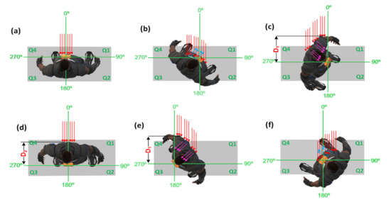 Body position and the status of the electromagnetic waves for different angle positions in each quarter. (a) at 0°, (b) at 45°, (c) just after 90°, (d) at 180°, (e) just before 270°, and (f) at 315°.