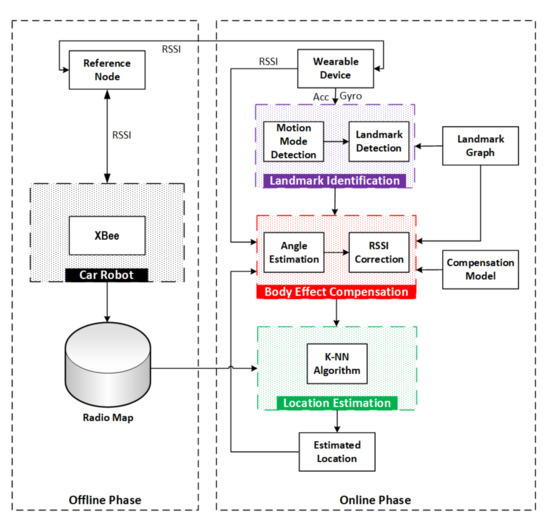 Proposed architecture of RSSI fingerprinting-based indoor localisation with user’s body shadowing compensation.