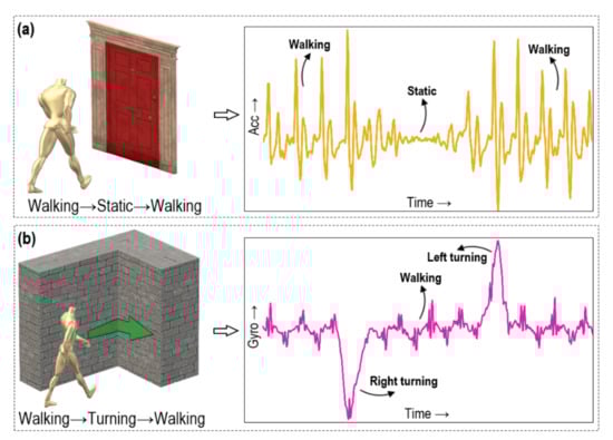 Turning landmarks are the sensory markers in the indoor map where the motion modes provide distinct signal patterns. In this study, data from both the gyroscope and accelerometer combinedly provide a specific motion pattern such as “walking→turning→walking”, corresponding to the direction of turning. Figure 5b shows the idea of turning landmark when a subject takes right and left turns. The rule for detecting a turning landmark can be expressed as follows:
