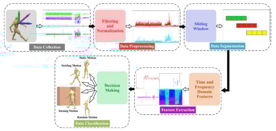 - Striding motion: this type of motion mode involves the continuous and smooth motion states that contain periodicity and similarity characteristics for a particular time period in their feature set attributes. It includes the motions that change a subject’s spatial position, e.g., plain walking, walking on stairs, or running.