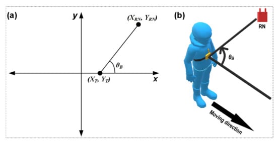 In this study, the path segment where the user is walking during the angle estimation is considered as the line corresponding to the x-axis. Thus, the angle is calculated between the moving path and the line connecting the current location of the user and the location of the RN (Figure 8b), as follows: