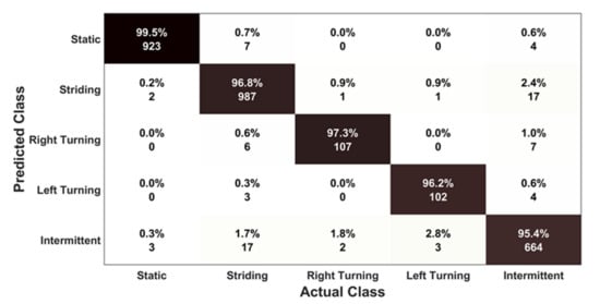 As can be seen from the confusion matrix, the classifier can detect the correct motion mode in more than 95% of cases, irrespective of the type of motion class performed by a participant. The highest accuracy of 99.5% was attained by the classifier for the static motion mode. As reported, 2 and 3 segments out of 928 segments for static type motions were misclassified as striding motion and intermittent motion, respectively. The main reason behind this confusion is because of the simulated door opening activities performed by the participants, which are actually considered as static activities; however, this type of activity sometimes may generate high energy and variance in the signal which can satisfy the decision thresholds, leading to misclassification.