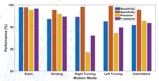 As presented in Figure 11, the overall sensitivity, specificity, precision, and F-measure of the proposed motion mode classifiers are 97.03%, 99.28%, 95.17%, and 96.06%, respectively, which can eventually produce high accuracy for the landmark identification task.